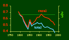 Obviously, both total and rural density correlated fairly highly with each other (left side of Fig. 2) and throughout the period, though each has been declining since the first part of the 20th century.