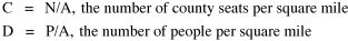 where k = (w/hv)2/3. The number of counties which will minimize time is thus given as a function of the region's population and area. Algebraic manipulation produces four more equations. Division of Eq. 10 by A produces Division of Eq. 10 by P produces Inversion of the left side of Eq. 11 results in Inversion of the left side of Eq. 12 results in Eq. 11 is identical to Eq. 2 derived from expectation algebra. Eq. 12 is the parallel to Eq. 11.; the latter gives the density of county seats, the "center density" (C = N/A), while the former gives county seats per capita, the rate (R = N/P). Eq. 13 is the original size-density equation, except here the term on the left refers to the average county size in a region rather than the size of a given county. Eq. 14 is a parallel to Eq. 13; it gives the average population per county. (I use lower case "a" and "p" to distinguish these from regional areas and populations.) The relation among the four equations is shown in Table 10-3 (with D=P/A, C=N/A, R=N/P, a=A/N and p=P/N):