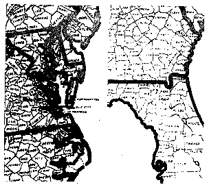 Since the introduction of the automobile there has been more talk of county consolidation than further division.[8] Georgia consolidated three counties into one after 1930 (see Table 2-1). Connecticut and Rhode Island have abolished the county as a unit of local government[9], in effect consolidating at the state level. Transportation technology, in the form of the school bus, led to school district consolidation (from 140,000 districts to 50,000 between 1947 and 1957) and the car to consolidation of rural churches (20,000 of which disappeared between 1930 and 1950).[10] Other than the few exceptions just indicated, county consolidation has remained mostly talk. The 3,000+ horse-and-buggy units of government, with all their attendant officials and costs, persist. SOCIOLOGY & COUNTY SUBDIVISION My original question about variation in county size now appeared to have been answered. The size of counties was a function of the technology of transportation at the time they were settled. Intensive settlement, prior to the automobile, resulted in smaller counties; less intensive settlement left large counties unsubdivided.