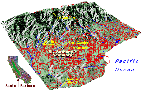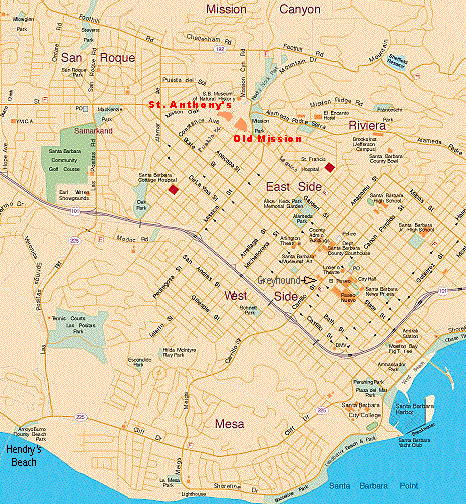 Gardens nearby. Some quotes from Santa Barbara's homepage [defunct at least as of 5/2/98] -- Mission Santa Barbara, called "Queen of the Missions" for its Graceful beauty. Founded in 1786, tenth of 21 Franciscan missions in California. Beautiful setting overlooking city. Museum of Natural History, exhibits feature mammals, birds, fish, reptiles, plant life, and geology of the Pacific Coast and Channel Islands. Dioramas of prehistoric Native American life. Planetarium. Santa Barbara Botanic Garden, sixty acres of native trees, shrubs, wildflowers, cacti, in natural setting. Three miles of easy-to-walk nature trails. Arroyo Burro Beach - Located on Cliff Drive near Hope Ranch, it is accessible from the west end of Las Positas Road. There are 600 feet of sandy beach, picnic facilities, volleyball, tidepools and a very curious home for cats. Nearby bluffs are a good spot for whale watching and hang gliding. Arroyo Burro Beach is also known as Henry's Beach or Hendry's Beach - only a true Santa Barbaran knows which name is correct. Great panorama view of the beach. |