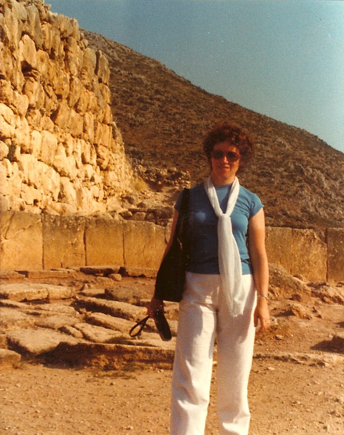 We learned later that the Greek government had obtained loans to build a string of these hotels. Back then it was very hard to obtain up-front money from private sources. A typical pattern for home builders was to put up a concrete shell with holes for two housing units on the bottom, two on top. Then when you had the money, complete the first unit and live in that. Then when you had enough money in hand, build the second (as a rental), and later the third, and at last the fourth. There were hundreds of these not-yet-complete structures all over Greece. Mycenae -- Hated to leave our room, but did in order to take the excursion to Mycenae. We saw the famous beehive tomb (c. 1250 BC), then drove up to the acropolis. It is a beautiful place, situated high above the valley between two sharp bare peaks. It is very quiet and empty there. Also, being inland, it is very hot and dry.