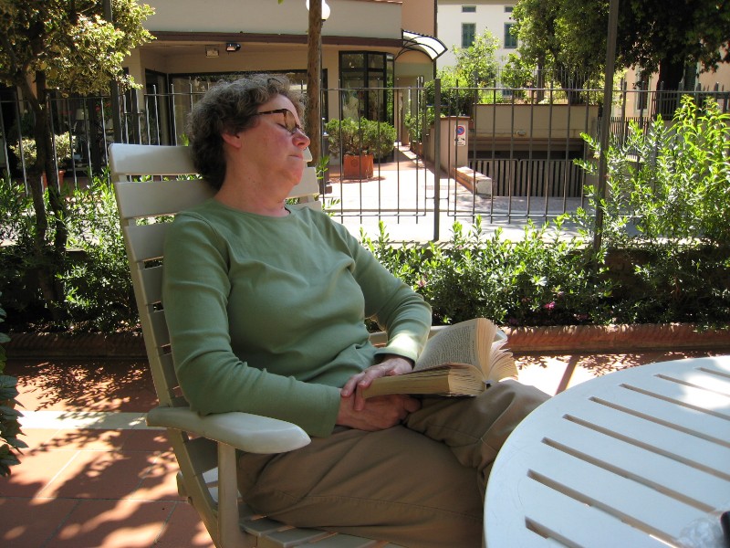 On our way back to the hotel we stopped at the Desideri Gelateria at Viale Verdi, 84 and each had a cherry gelato. They were wonderful ... all that Sabrina promised they would be. It was so filling, in fact, that we skipped lunch and spent an hour or so in the courtyard reading. Well, I was reading. Karen dozed off. Sabrina lectured on the development of the Italian language and its relation to the history of Italian unification. With the collapse of Rome Latin gave way to Germanic tribes in the north, Arabic in Sicily, Spanish in Naples. St. Francis, who spoke to the people, preferred local dialects over classic Latin. The troubadours spread vernacular through popular song. Bocaccio's 1348 Decameron was the first prose work written in Florentine; it was later used as a basis for the dictionaries and grammar (the first of which was by Pietro Bembo). In 1764 Italian becomes the official language of the courts, then for education. Later influences: radio, Mussolini, trains, intermarriages, movies, television (first broadcast in 1954). After dinner we went to the courtyard where we visited with Gloria Valone, Denny and Pamela Hovik, and Richard Flower. |