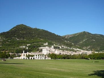 Today we went to Gubbio. As Marco promised, it was a beautiful ride through hilly country, more sparsely populated than other parts of Umbria, partly because of the many earthquakes (there is a named Gubbio Fault). We saw a small herd of Chianina cattle along the way. Huge, pretty things, with almond eyes. The enormous size isn't an illusion. We've had an equally large black half-Chianina steer at our county fair the last couple of years.