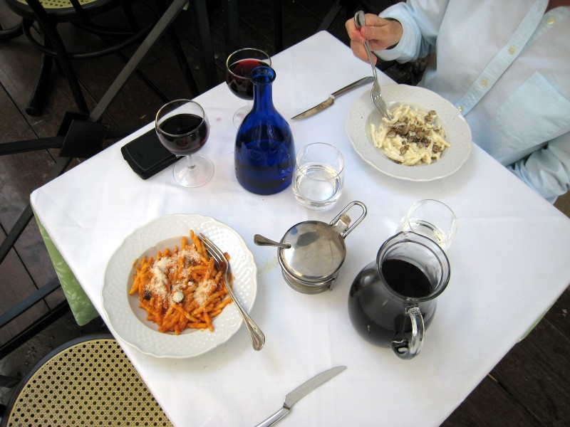 We tired of the museum and left early to do some exploring on our own. We found a restaurant which had been recommended in one of our guidebooks called "San Francesco il Lupo" (Via Cairoli,24, just off via Garibaldi) and had lunch there -- pasta called strangozzi (priest strangler), Karen's with cream and truffles and mine with the house sauce which was truly delicious. We shared a liter of house red. We sat outside in very cosy proximity to passing cars and buses. I couldn't afford to lean back in my chair -- just a few inches back and my chair would fall into the street; if I reached my elbow backwards a bus might hit it.