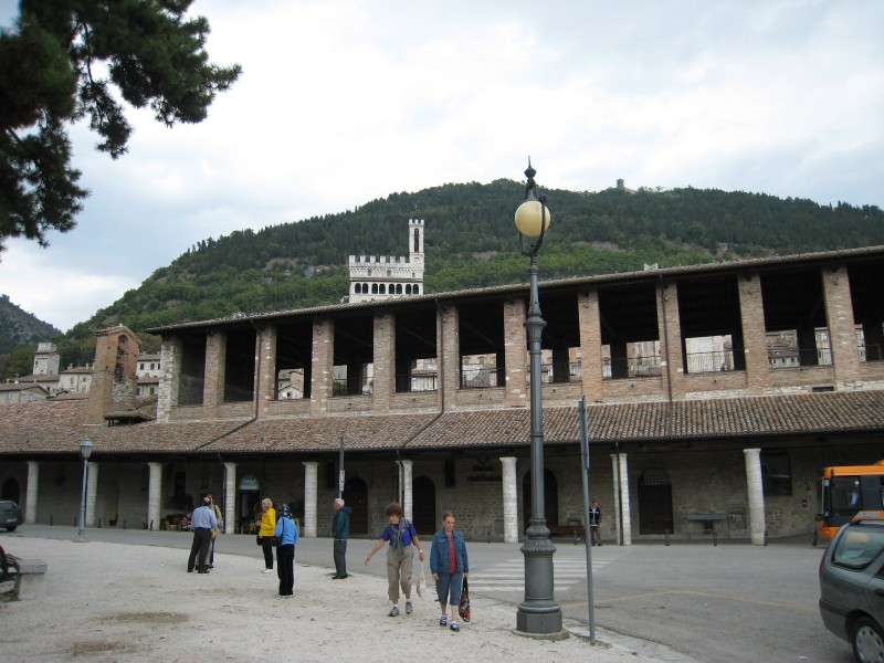 Market Day When we got off our bus, we were greeted by a beautiful market array of vegetables and plants. We later learned that the market was located at the Loggia dei Tiratori (#3 on the largest map above). This ancient place was the location of the Wool Corporation and built toward the end of the 5th Century. The building reflected the importance of wool in Gubbio, when the cloth produced was exported all over the world. The center of the Tiratori is an open gallery where, after having been dyed, the cloths were stretched in the sun.
