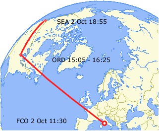 Rather than hang around, we decided to make an early exit from the Satellite Palace, so we were ready for the 7:30 shuttle to the airport. It was on time, a nice, big bus, and we made the trip to Fiumicino without incident. Leonardi da Vinci airport (Fiumicino) Didn't have all that much trouble finding where we needed to go to get our boarding passes and check our bags. And we found the security check line with only a bit of bumbling around. Passed through security with no problems. My pacemaker situation - always bothersome in America - was, once again dealt with courteously and efficiently by the Europeans. The American TSA officers appear homophobic and paranoid -- "Do you mind my touching you?" after which they grope every inch of your body -- while the Europeans always are casual and brief (this guy barely touched me, on the ribs only, before wishing me a safe trip. Had a little delay at boarding because the buses hadn't arrived to take us out to the plane. Fortunately the bus drivers hadn't decided to go on a spur-of-the-moment strike, and we were on our way after twenty minutes or so. Our flight took ten and a half hours, and the captain made up the time we lost boarding. Our schedule allowed an hour and a half between landing and our 4:25 flight to Seattle. Ordinarily this might have been enough time, but we had to go through baggage claim, customs, baggage re-check and another security check, plus walking what seemed like miles of empty corridors. All the while the clock was ticking. An airport official told us we'd never make our flight. Sigh! And we wouldn't have made it, but bless the weather gods! The plane to Seattle had been delayed for half an hour, and we made it to our departure gate at 4:35. Sea-Tac and home After another 4-1/2 hours in the air we landed in Sea-Tac on schedule, collected our checked luggage without too long a wait, and made it to the Shuttle Express stand without too great a struggle. We checked in and were seated in a van within a couple of minutes. Then had a lengthy (to us anyway, we'd been up for 28 hours) wait while our driver tried to track down a passenger who was scheduled to join us. Fortunately, he gave up searching -- or got tired of me heaving sighs -- and we were on our way.