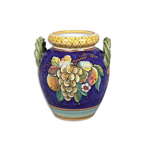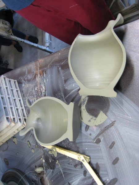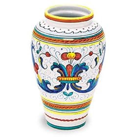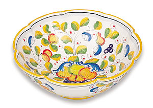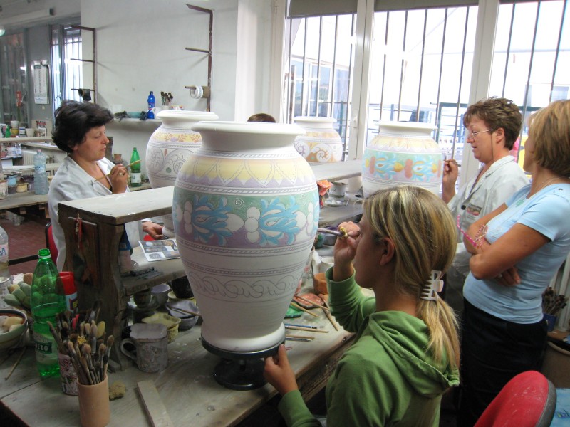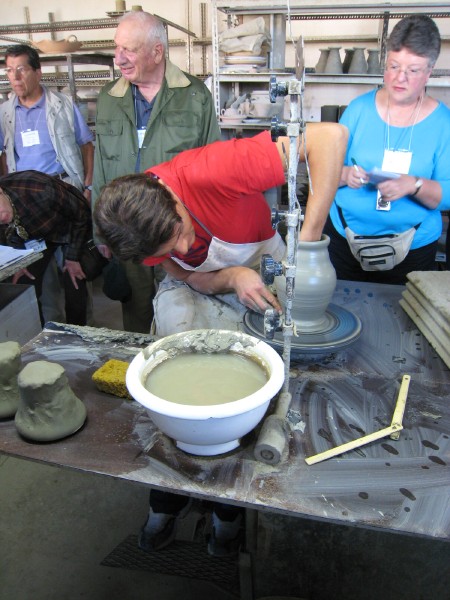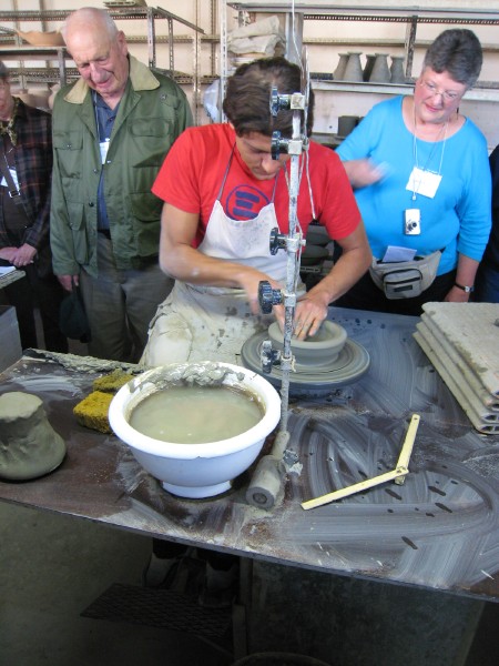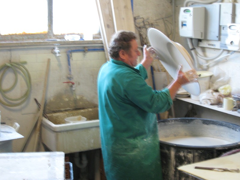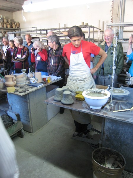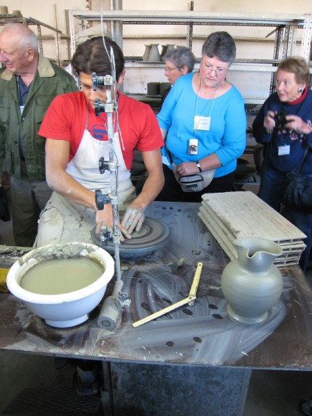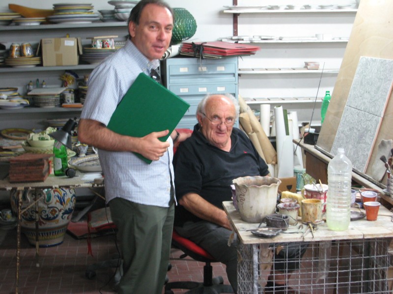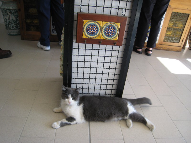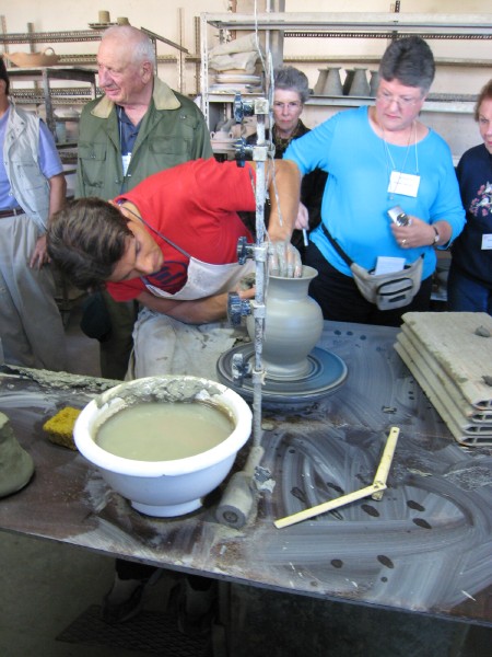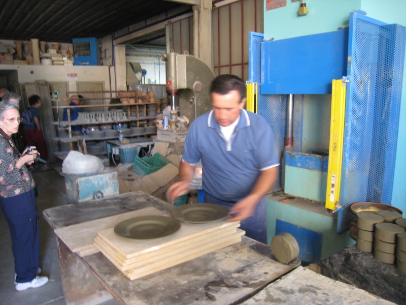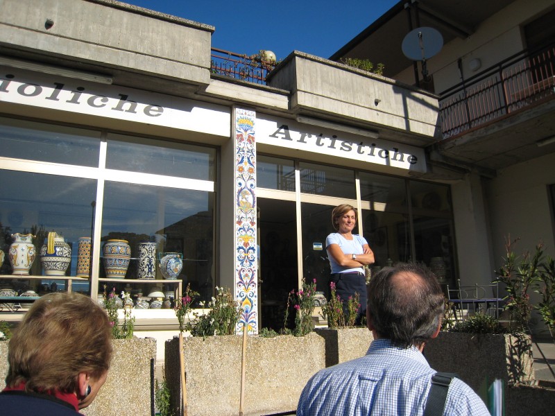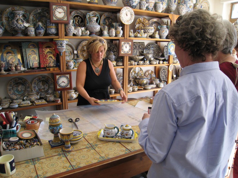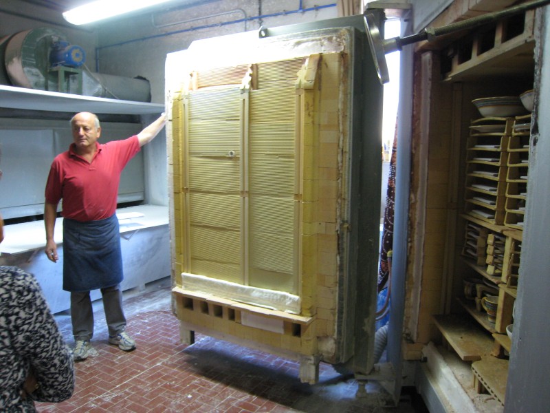 We rode across the valley to our first stop, Sberna Ceramics (Ceramiche Sberna) in Deruta. After receiving a warm greeting from Anna, the daughter of the owner, we went directly to the basement of the shop where we watched Roberto, a highly skilled craftsman, take no time at all to throw a pitcher and a plate on the wheel. He began with a moment of meditation, then plopped one of those three bpictured blobs onto the wheel. He soon hollowed that out and began squeezing the walls upward. He continued raising the sides by using his fingers to thin and shape them. Finally he formed a lip, then stopped the wheel and pinched the lip form a spout. Once we finished ooohing and ahhhing, Roberto then sliced his new pitcher in half (ouch!) to show us its walls, after which he quickly formed a dinner plate. These are the handmade products. We also saw a man using a mechanical press of some sort to stamp out plates for mass market customers such as Starbucks, Williams-Sonoma and Pier 1. Next, after drying for five days, the pieces were dipped into glaze by a man named Francesco. After glazing, the pieces are fired, then hand painted, then fired again. This was definitely handwork, not the "industry on parade" machinery we think of when we think "production". There's a description of the glazing/decorating process here. We were fortunate enough to find Francesco Sberna himself, the founder of the business, at work painting tiles. His signature on the bottom of a piece puts it well outside of most people's range. He's a man in his eighties who looks, as Marco said, like someone from Dante's second circle of Hell: short, fat, devilish, always looking for something or someone to make a joke about. Upstairs, we had a chance to shop from an enormous selection of gorgeous things. Were helped by Francesco's daughter Anna and Mrs. Sberna as well. We also met the family cat, Ringo, who is the darling of the family and of most visitors. We bought a cream and sugar set with tray in a traditional Deruta pattern and a small serving plate in a peacock tail motif. What we left behind was a sensory overload of beautiful pottery: