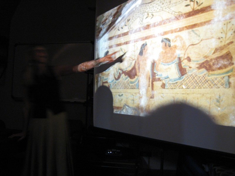 Louise gave an historical overview, beginning with 900 BC Iron Age origins. East of the Tiber, they had agricultural surpluses and iron to trade with others. They also had coastal cities, mined iron ore at Volterra, along with copper and gold. With leisure, they became the first Mediterranean portrait artists. Their priests took a strong interest in studying the weather and bird flights. The Etruscans were the first people in Italy to practice dentistry. They used wool cloth mostly and had to import linen. They did extensive trade with the Greeks and were much influenced by them; their temples were built on the Greek model ... column, steps, tiled roofs with sculptures. Moreso than the Greeks, their women could own land, were educated and could write. They loved shoes. I noted a strong similarity between their art and that of the Minoans who perished when Thera blew up in 1400 BC. The richest period of Etruscan culture was 650-300 BC. During the Hellenistic era things began going downhill and the Etruscans were gradually absorbed by the Romans. Fascinating people.