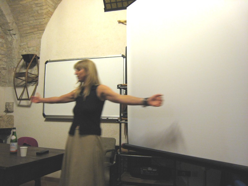 On the way back to Assisi we stopped so the shutterbugs could take all they wanted of the panoramic view of the town. I took some but gave up when I realized that a large yellow crane was dominant in nearly ever angle I could get to. My experience with shots like this is that it's better left to professionals: they can choose the vantage point, time of day, weather (overcast sky usually works best for me, e.g.), amount of tourists (usually none on a cold clear winter morning), etc. For my own activity, I much prefer snapshots with folks I know in their exotic or historical setting. Back-to-back Double Lectures (ugh) -- Etruscans and Rural Umbrian Life During the afternoon, after a fairly exhausting morning, we were treated to two double-length lectures, each of which would have been excellent on its own but, packed together in one long postprandial orgy of lecturing, were simply too much of a muchness. Such thoughtless scheduling was one the major criticisms I raised in the final evaluation of the program.