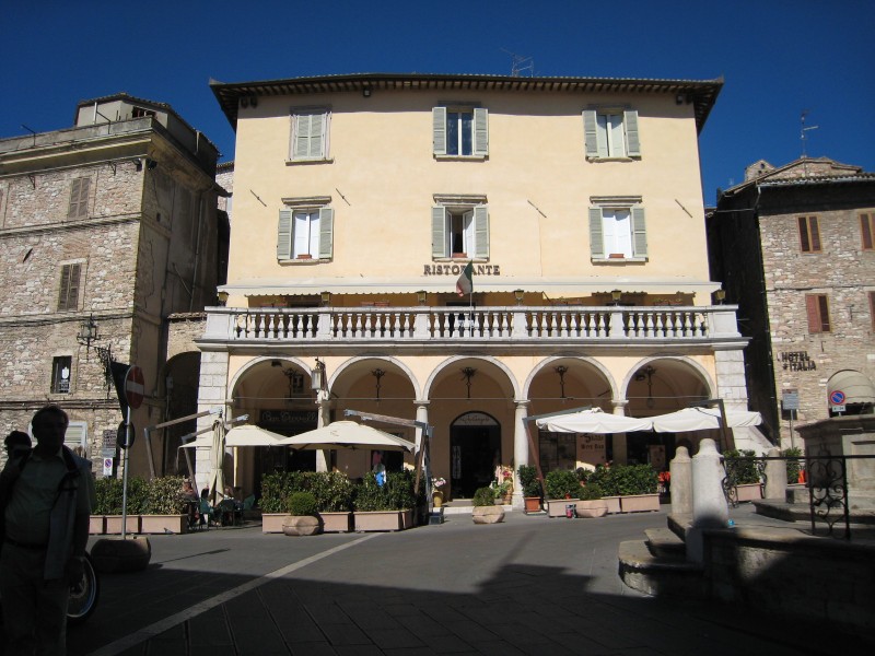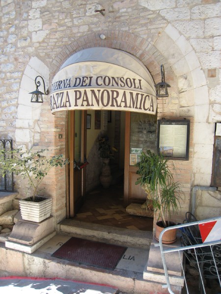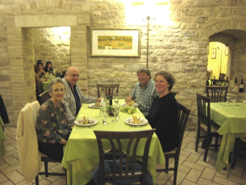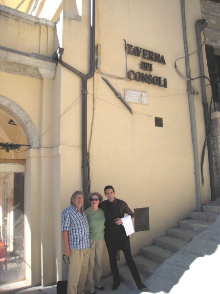 Anne Robichaud received her degrees in both English Literature and Italian Language and Literature from the University San Clara (CA). She has made her home in Italy, just outside Assisi, since 1973. Her presentation was a lively, more-or-less personal memoir of her experience with rural life, essential for understanding the outlook of Umbrians. She has a website, and she has written on the 'net briefly about the subject of her talk to us, "On the Land in Umbria". The photo, from this site, shows Anne and her Italian husband Pino. Dinner at Taverna Dei Consoli -- molto delizioso!