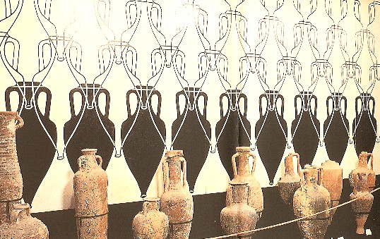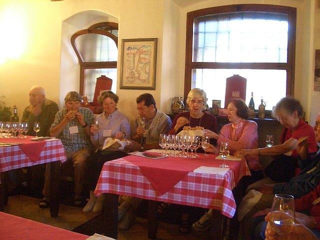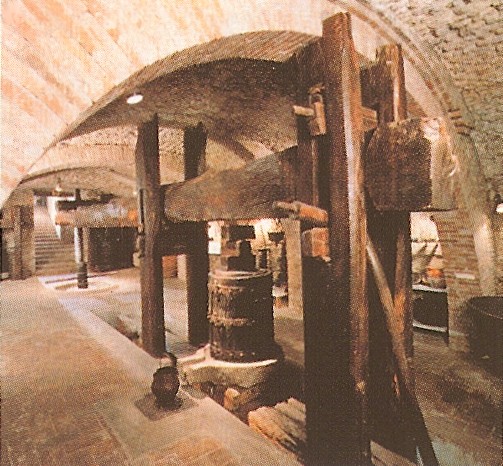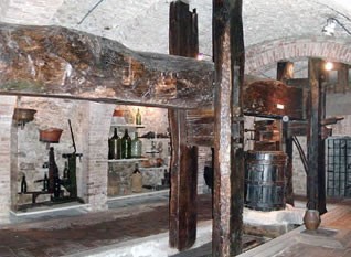 The museum was the idea of Countess Lungarotti, who not only runs a thriving winery but also an agriturism complex. She and her late husband, Count Giorgio Lungarotti, created the museum and opened it in 1974. Today the museum is operated by the Lungarotti Foundation. It is located on the first floor and basement of the Palazzo Graziani-Baglioni, a 17th century noble summer residence. The museum is a fascinating combination of a history lesson along with the story of the development from ancient times of the making and drinking of wine, illustrating not only the evolution of the equipment for making wine but also the vessels used for storing, transporting, and drinking wine. There are also many art works, drawings, paintings, prints, and ceramics illustrating the consumption of wine. Featured in the basement is a huge wooden wine press. The beam is 12 meters (about 40 feet) long, all of one solid piece of oak. At the other end from the grape barrel is a huge wooden screw, turned by either animals or men, applying immense leverage to the press in the barrel. I also learned something from the display (seen above): those amphorae with the pointed bottoms? They were plunged into sand in a ship's hold. Then subsequent layers of jugs were inserted into the mouths of those below. I was also pleased to be able to answer our guide's question about what the little plate with two handles was used for Kottabos, a game played in the Andron (I learned about that long ago, in San Francisco's now-defunct Wine Museum).