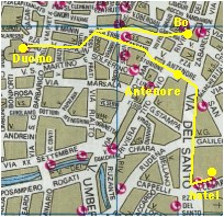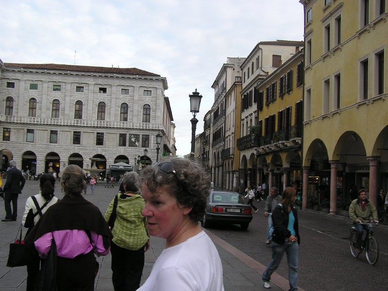 Karen and I began the day with a 7:00 walk toward Prato della Valle and managed to get lost on our return up the via Rudena. I ducked into a coffee bar and asked "Dov' è il santo?" and was pointed in the right direction. When we returned we had a huge breakfast from tables laid out for Elderhostel: salami, cheese, boiled eggs, maybe ten kinds of bread/rolls, yogurt, cereal, coffee, baskets of various fruits. This room, with its huge breakfast, was in a separate building from our hotel. Other meals were in a private restaurant room at the end of hotel's regular dining room.