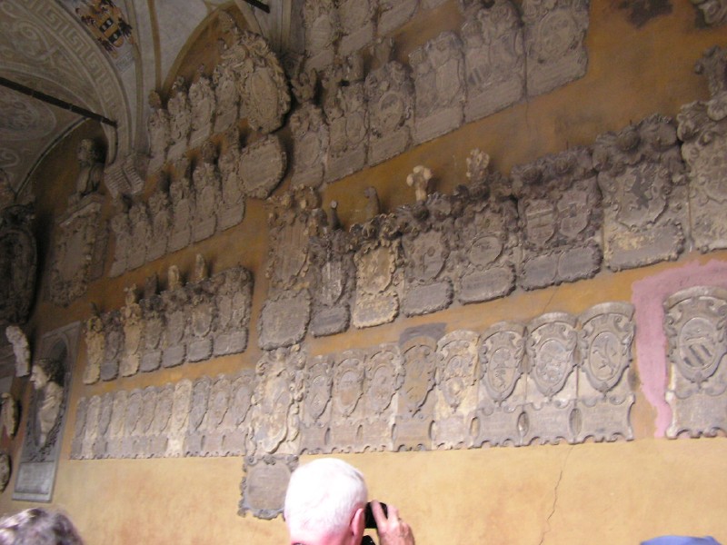 Re-tracing our way, we went to the Palazzo Bo (University of Padua). There we saw Galileo's lecture hall, the teatro anatomico where the first dissections were performed (we stood below the corpse area and looked up into it), and the beautiful room where they still conduct oral exams for the MD degree. This contains paintings of famous anatomy teachers who taught there -- Andreas Vesalius, Bartolomeo Eustachio, Gabriele Fallopio, William Harvey. That room also contained a shelf full of the skulls of early faculty; they had donated their bodies for their students to dissect. I wonder why my students and professors never thought of that. |