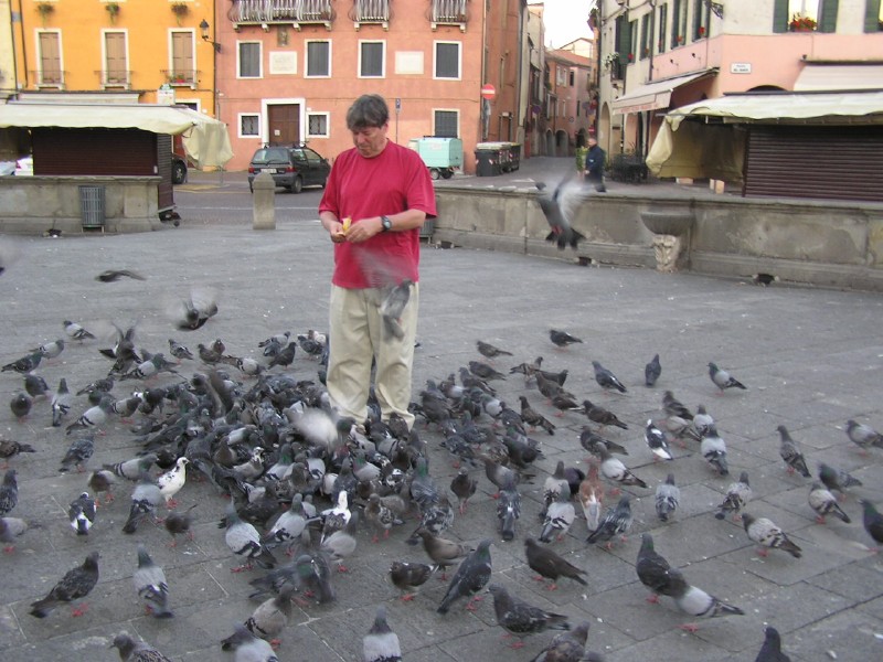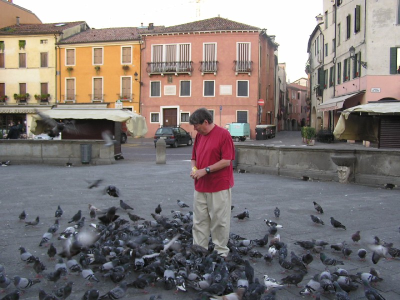 We made one final pilgrimage to the Basilica piazza to feed the pigeons - every morning we took Zwie-back from the dining room to do this. While we were distributing our largesse an old Italian heard me refer to them as piccioni and emphatically insisted (in Italian) that I call them colombe, doves. Pigeons may be "rock doves", but these definitely were pigeons.