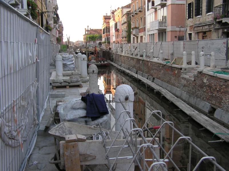 Venice is often referred to as an island. Actually it is 117 islands separated by a network of 180 canals, including the Grand Canal in the shape of an 'S'. Today's canals were originally just the waterways separating those islands. When Napoleon conquered Venice his Austrians (who preferred horses to boats) filled in many of the canals. Over the years the "island" has been sinking. Routine dredging the remaining canals, permitting the water to circulate, appears to have lessened that problem. Behind our hotel is the Rio Della Fornace which was in the process of being dredged while we were there.