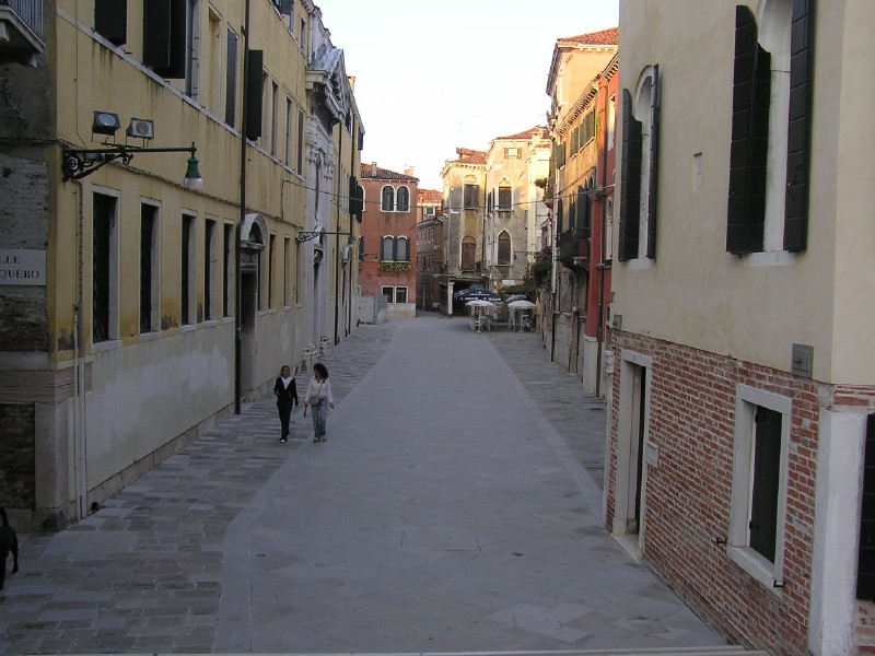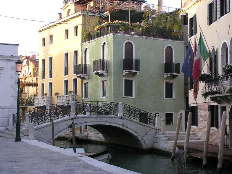 It's a very short walk from the Salute vaporetto stop to the Hotel Messner. Alongside the Chiesa [church] della Salute, there's a footbridge over the Rio [small canal] Della Salute leading to Rio Terra [literally "earth river", a filled in canal or alley] dei Catacúmeni, at the end of which is our hotel. This part of town is very quiet and residential. In contrast with some of our tour companions (who could barely find space for their suitcases) our room is large by Venetian standards. It was not in the main part of the hotel but several doorways down the R.D.Fornace. The shower (not pictured) was much better than the doorless one in Padua.