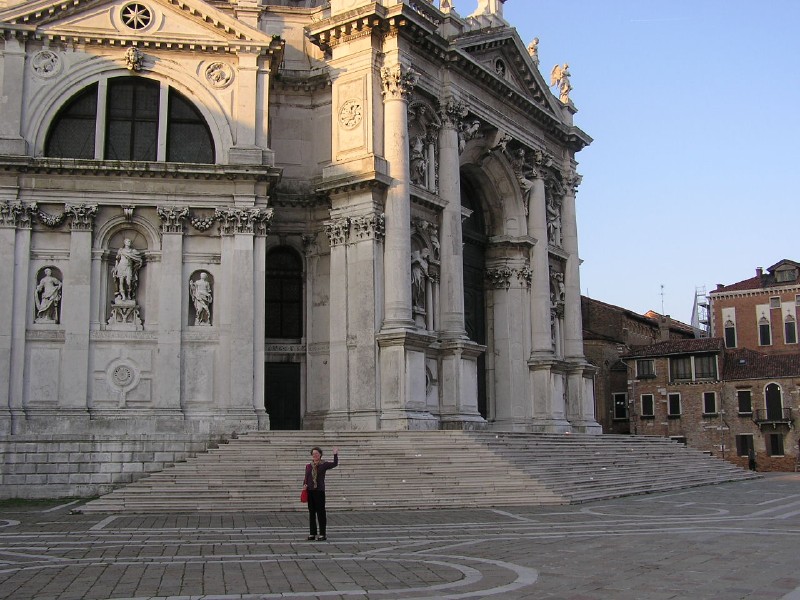 After a dazzling trip the length of the Grand Canal we arrived at our stop, Salute. It's named for the enormous church of Santa Maria della Salute, built in 1630. Plague had killed a third of Venice's 150,000 citizens and the Venetian Senate made this pledge: "Stop the plague, and we'll build a church to honor the Virgin Mary." Cooler weather that October killed off the plague-ridden fleas and the church was built.