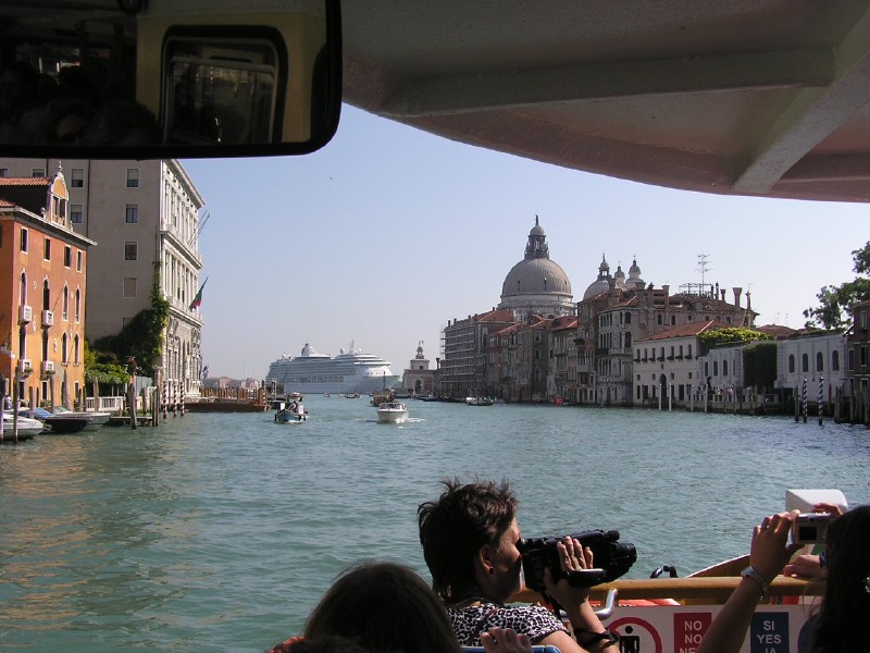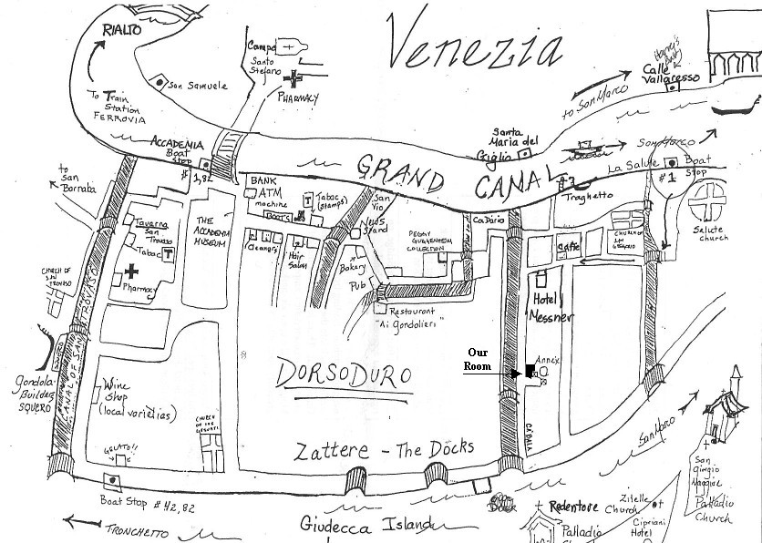 We boarded the vaporetto - for which our tour had supplied us a week long pass - at the Piazzale Roma stop and rode down the Grand Canal, under the Rialto Bridge, under the Academia Bridge, to the Salute stop and made our way to the Hotel Messner on the Rio Della Fornace. You can follow our route past all the vaporetto stops by placing your cursor over over the plain red dots which line the canal -- the names will appear over a google link to many images (just click the dots). The red dots with black outlines are major sight-seeing places mentioned on these pages; they also are hyper-linked to the internet.