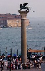 The book in the shield says "Pax tibi Marce evangelista meus" ("Peace to you, Mark, my evangelist"). The open book suggests peace; a closed book suggests wartime.