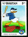 The baseball stamp craze embraces stamps printed on copper, silver and gold foil, akin to the metallic pressings seen in premium baseball cards of recent years. In 1992 St. Vincent and Grenadines issued the first ever baseball-stamp and baseball-card combination. There are twelve cards honoring "Baseball Hall of Fame Heroes": Cobb, Dean, Feller, Ford, Gehrig, Hornsby, Ott, Paige, Ruth, Stengel, Wagner and Young. Each is a legal $4 stamp (East Caribbean currency), should you wish to mail something from there. Each is also a baseball card, with a rear side showing career information, birth and death dates, and the date of Hall induction. In 1986 Grenada issued a set of eight stamps showing Donald Duck and his nephews, Mickey, Minnie and Goofy playing ball. The same year "souvenir sheets" embedded $5 stamps in larger pictures of entire ballparks full of Disney characters. In 1988 Grenada released nine "sheetlets" of nine stamps each, featuring such players as Molitor, Mantle, Ripken, Carew, Puckett and Carter. When the set was re-issued two years later, the stamp which had honored Pete Rose was replaced by one with no more than the words "U.S. Baseball Series I."