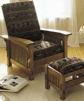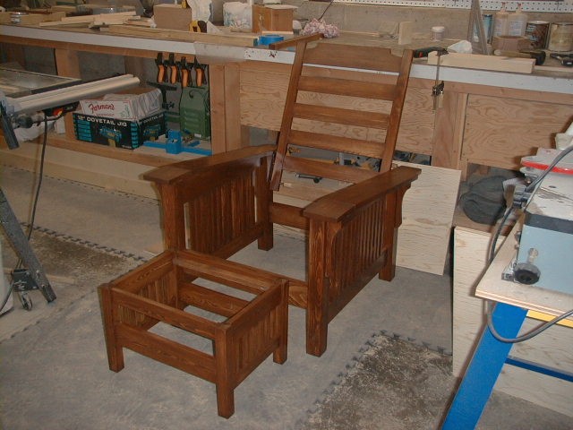Morris Chair: The Mission-style (or Arts & Crafts) version of a Lay-Z-Boy. My sister-in-law expressed interest in my making a Morris Chair for her. She wanted it made of hemlock. Since that's not very easy to work with I made much of it out of pine. I got the plans (first two pix) online, and I would recommend you get those also (the pictures here are not enough). Contrary to the plans, I used only 3/4" boards except for the arms. After experimenting with copper re-inforced peg holes I decided it would be better all around to make the arms of 2 x 6 hemlock boards. They came out very nice. The wood is stained with Wood Kote's Jel'd Stain (Dark Mahogany) and finished with six coats of the same company's clear satin finish. If you're planning to make one of these I have two suggestions. I didn't make the through-tenons shown. I prefer the cleaner look of blind-tenons, plus they are much more forgiving should you have tear-outs on the tenon ends, e.g., or if your mortises don't produce air-tight fits with your tenons. Also, the cleats shown on the side rails for holding the seat cushions seem mis-placed to me. To get the cushion tops up to a level with the ottoman tops would have required a 9 or 10 inch cushion -- much easier to put the cleats higher up, which you can only do on the front and back rails. My sister-in-law will be taking care of the upholstering. When that's done I'll add some more pictures.